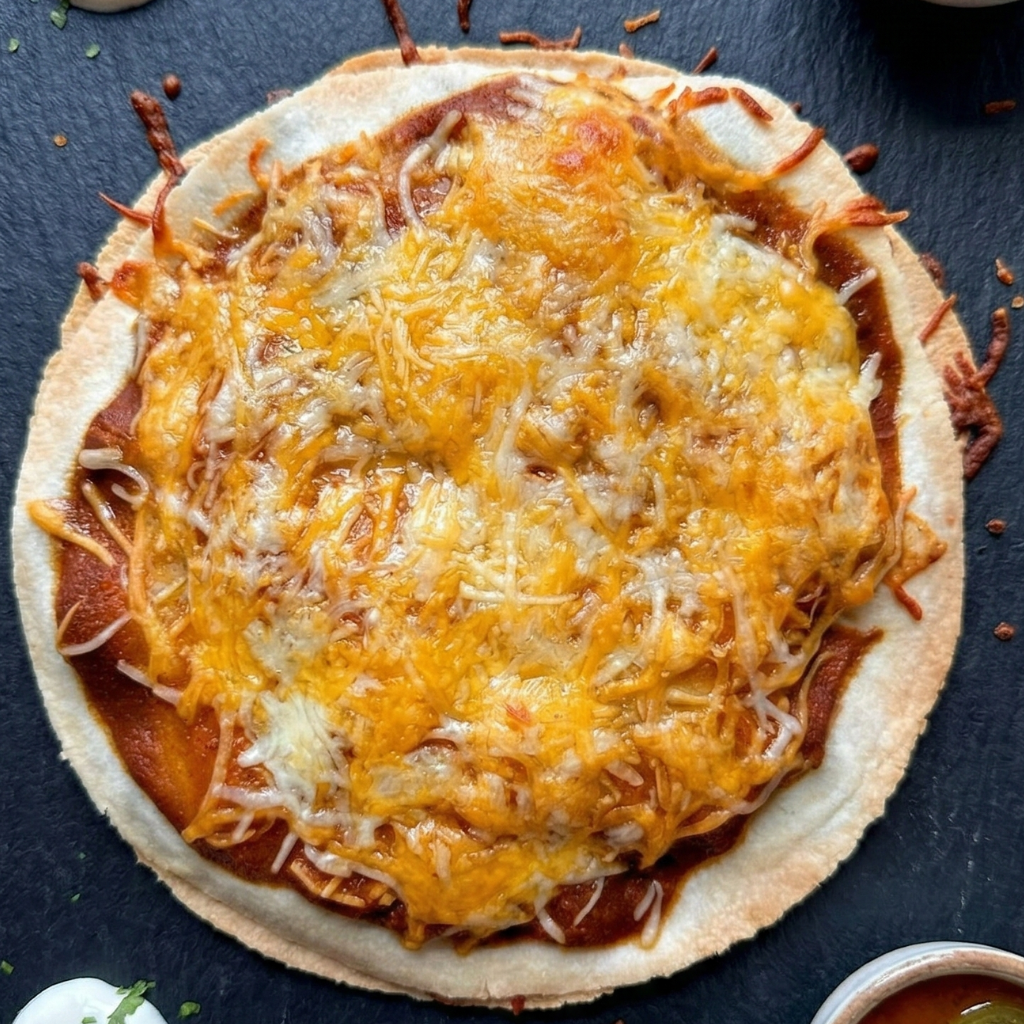 A Mexican Pizza is not quite a taco and not quite a pizza. It lands somewhere between a quesadilla and a flatbread pizza, which is exactly why it works so well. You have a crispy base, a hearty filling, a saucy top, and melted cheese holding everything together.