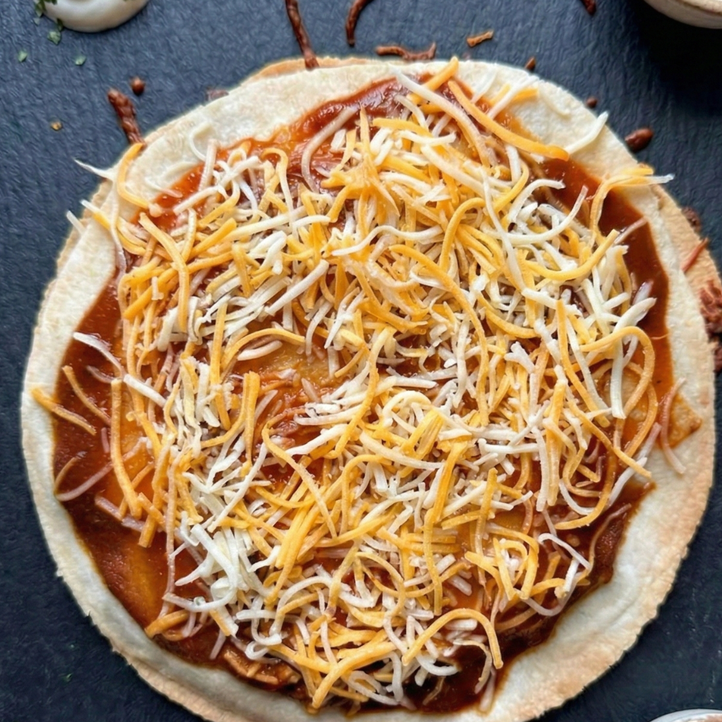 Place the second tortilla directly on top. Spread a layer of salsa or enchilada sauce over the top tortilla, just as you would with a regular pizza. Sprinkle a generous amount of shredded cheese over the sauce.